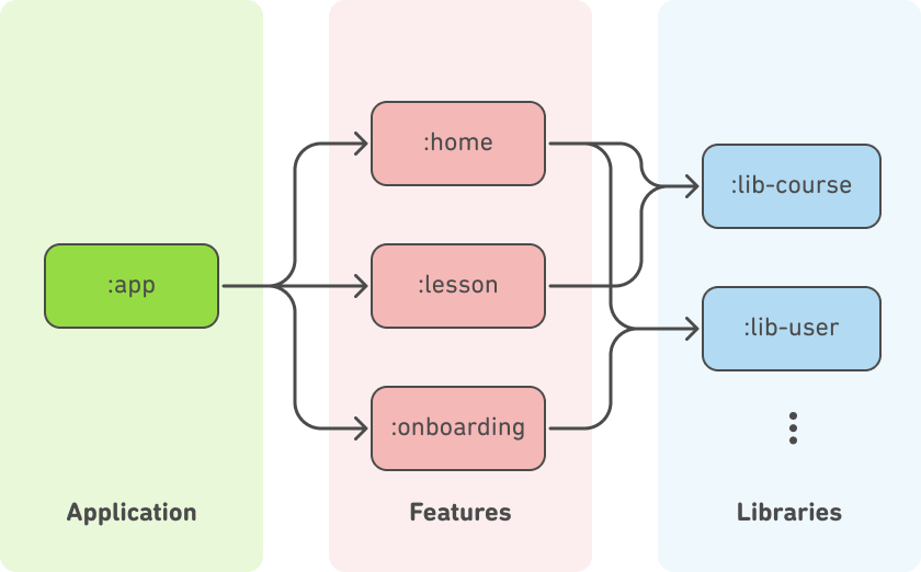 Often, two features will share a similar concept. Lesson and home features both require knowledge of the curriculum, or course, that we teach. Lessons require this information to generate learning exercises while the home screen visualizes course content as different, themed levels. In these cases, we organize the shared code into a library module, which features can access independently. This is known as a multi-module pattern, which helps limit what code is visible to and/or used by any given module: