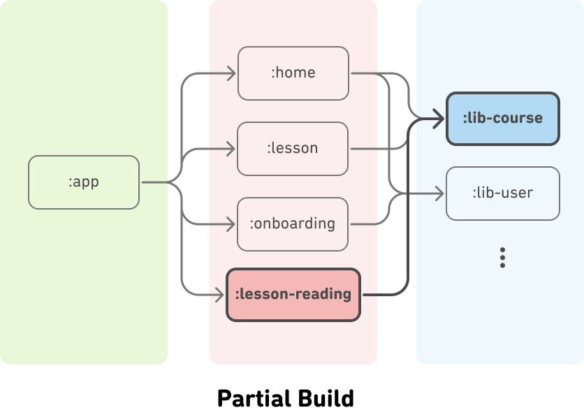 During development, we may not need to include all features in each build. We can leverage modularization to create partial builds that exclude unnecessary features. Let’s say we’re developing a new lesson flow for older kids that includes a reading experience for longer Stories. Given our module organization, the new reading lesson code is unlikely to impact other features, such as onboarding or home. We can leverage this notion of testing in isolation by building only the reading lesson feature. This way we save time by skipping the build steps for any unnecessary modules!