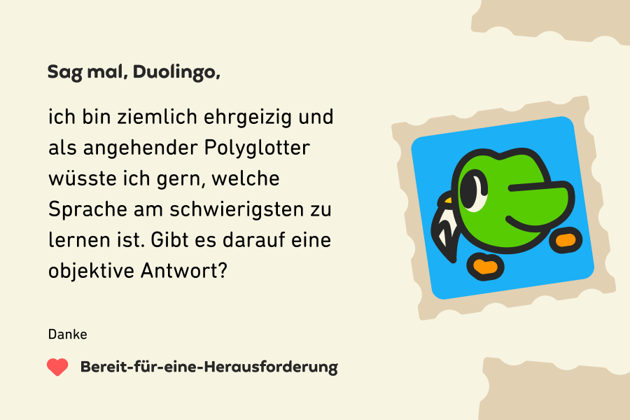 Wenn du mehr über das Thema Sprachen und Sprachenlernen erfahren möchtest, schreib uns eine E-Mail an dearduolingo@duolingo.com!