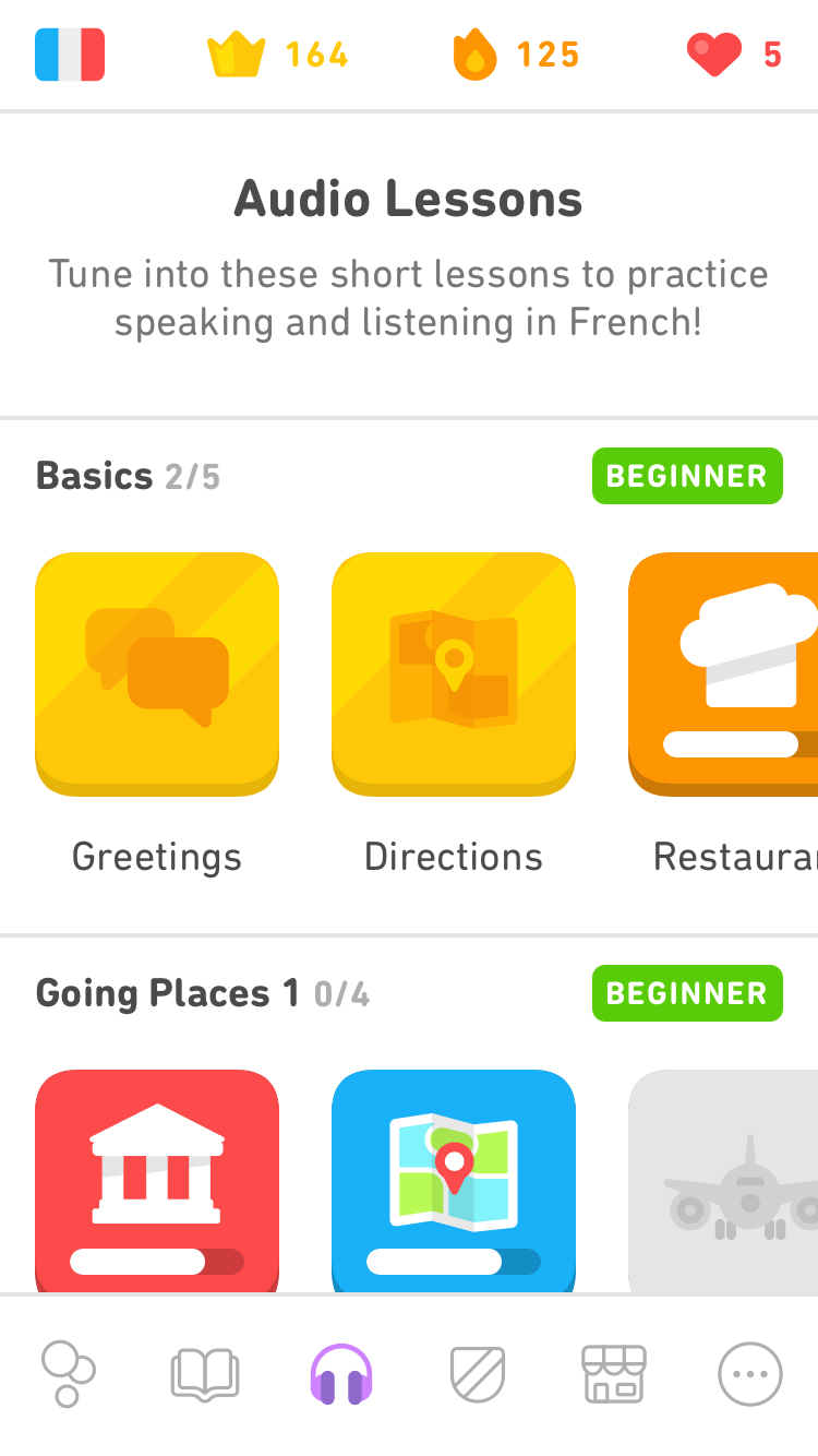 Puedes encontrar las Lecciones de audio en el curso de francés para hablantes de inglés y, próximamente este año, en el curso de inglés para hablantes de español y en el curso de español para hablantes de inglés. En este momento están disponibles en dispositivos iOS y llegarán a Android pronto.