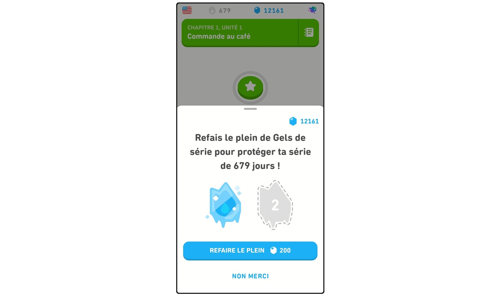 Plus vous prolongez votre série, plus le sentiment de nouveauté est susceptible de s'estomper. La fonctionnalité commence alors à vous motiver d'une façon différente. C'est là qu’entre en jeu ce que l’on appelle l'« aversion pour la perte », un biais du cerveau qui fait que l'on est particulièrement réticent à perdre quelque chose, comme sa série. Même les jours de flemme (ça nous arrive à tous !), on vous rappelle de terminer une leçon pour que vous ne perdiez pas votre progression. Bien sûr, perdre votre série ne signifie pas perdre les connaissances déjà acquises. Mais plus votre série sera longue, plus vous aurez envie de vous entraîner chaque jour pour la protéger !