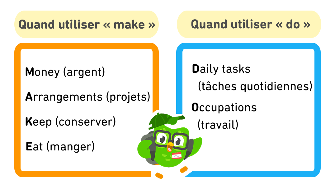 La prochaine fois que vous devrez choisir entre make et do en anglais, pensez à Money, Arrangements, Keep et Eat (MAKE) et à Daily tasks et Occupations (DO). Grâce à ce moyen mnémotechnique, vous retiendrez mieux comment utiliser ces deux verbes !