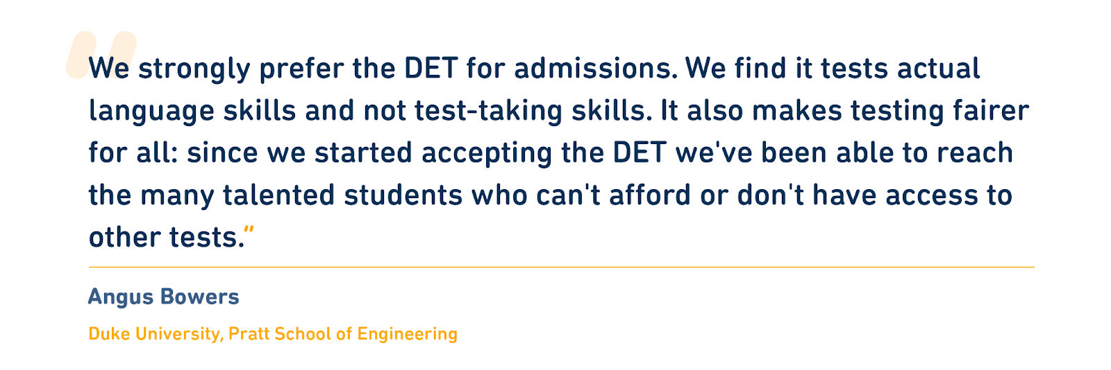 By accepting digital tests like the DET, institutions level the playing field for students and gain access to thousands more global applicants, diversifying campuses and making the learning experience richer for everyone. Dr. Douglas Christiansen, Vice Provost for University Enrollment Affairs and Dean of Admissions and Financial Aid for Vanderbilt University says that’s exactly why his institution accepts the DET: