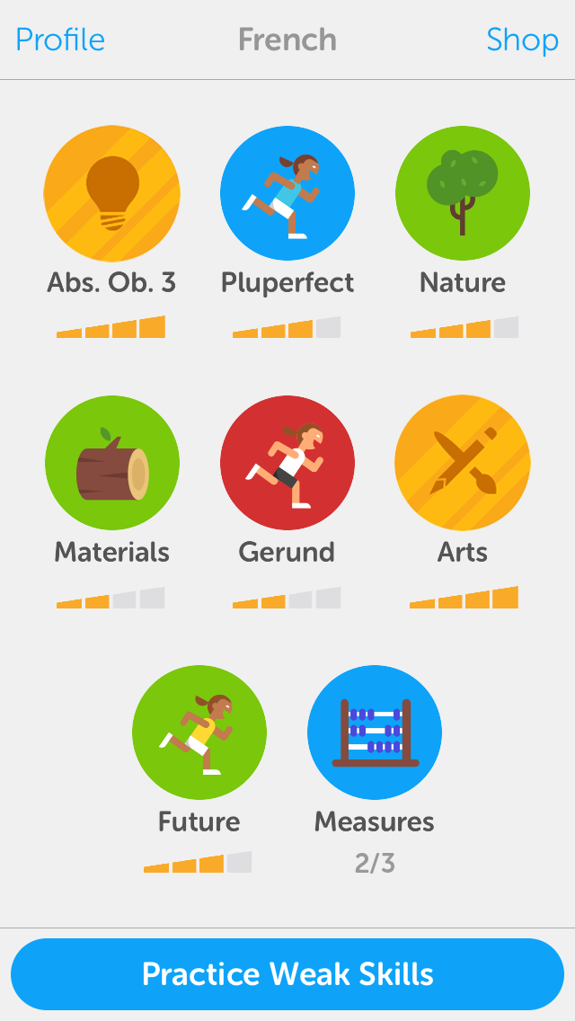As soon as you finish a skill, its strength meter is usually at full bars (with a gold icon). Once the meter slips to half-full, though, you know it's time to practice. You can do this by choosing a skill to see your weakest words, and then strengthen them with a custom practice session made just for you.[1]