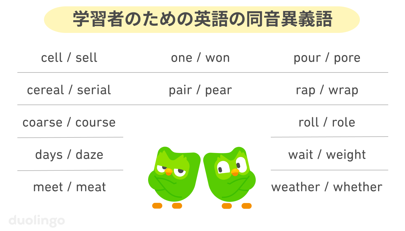 英語のスペルは誰にとってもやっかいですが、Duolingoのレッスンで、これらの同音異義語をおさらいみましょう。「buy」「by」「bye」を聞いて区別することができるようになれば、英語の聞き取りがぐっと楽になること間違いなし! 👋