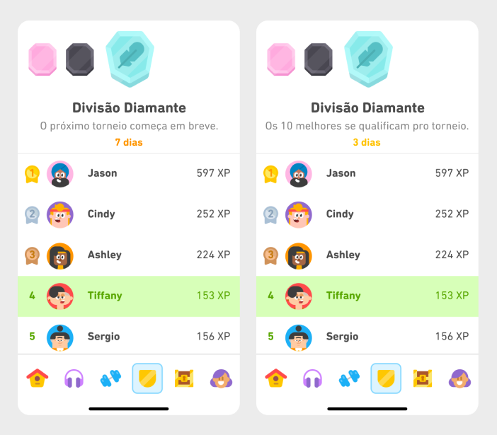 Tentamos manter as coisas o mais justas possível, então, a cada semana, colocamos você no mesmo ranking que pessoas que têm hábitos de estudo parecidos com os seus e que estejam mais ou menos no seu fuso horário. Mas o fato de os seus colegas de ranking nem sempre estudarem o mesmo idioma que você pode ser surpreendente — é que a competição acontece entre todos os cursos!
