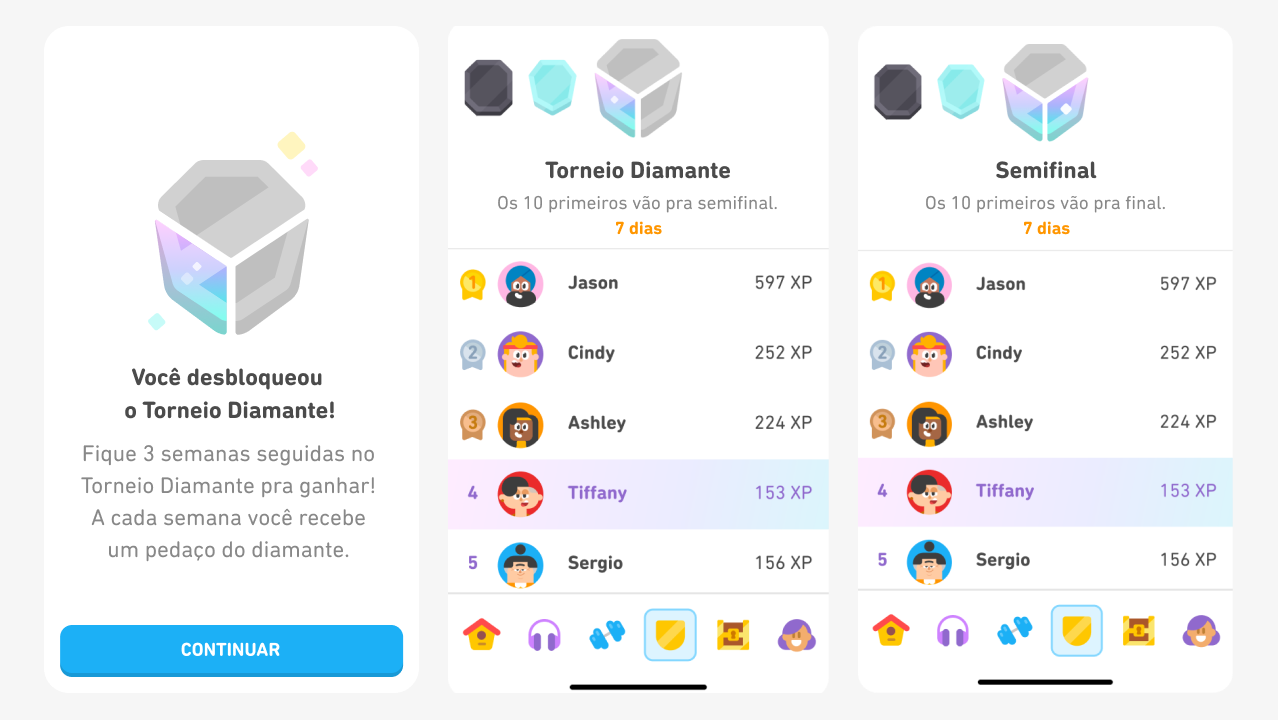 Recompensamos as pessoas mais engajadas com outra oportunidade de competir. Os 10 primeiros colocados da Divisão Diamante são elegíveis para entrar no Torneio Diamante (no iOS e no navegador, e em breve no Android!). A competição tem três fases: quartas de final, semifinal e final.