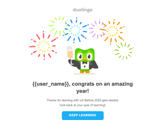 In December 2019, we sent the newsletter to our users highlighting their active days, time spent learning, number of words learned, and number of lessons completed. It was our first attempt to send an email with this level of personalization at a large scale, and our users loved it!