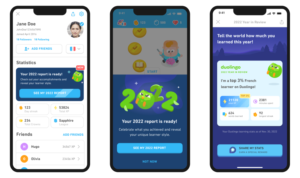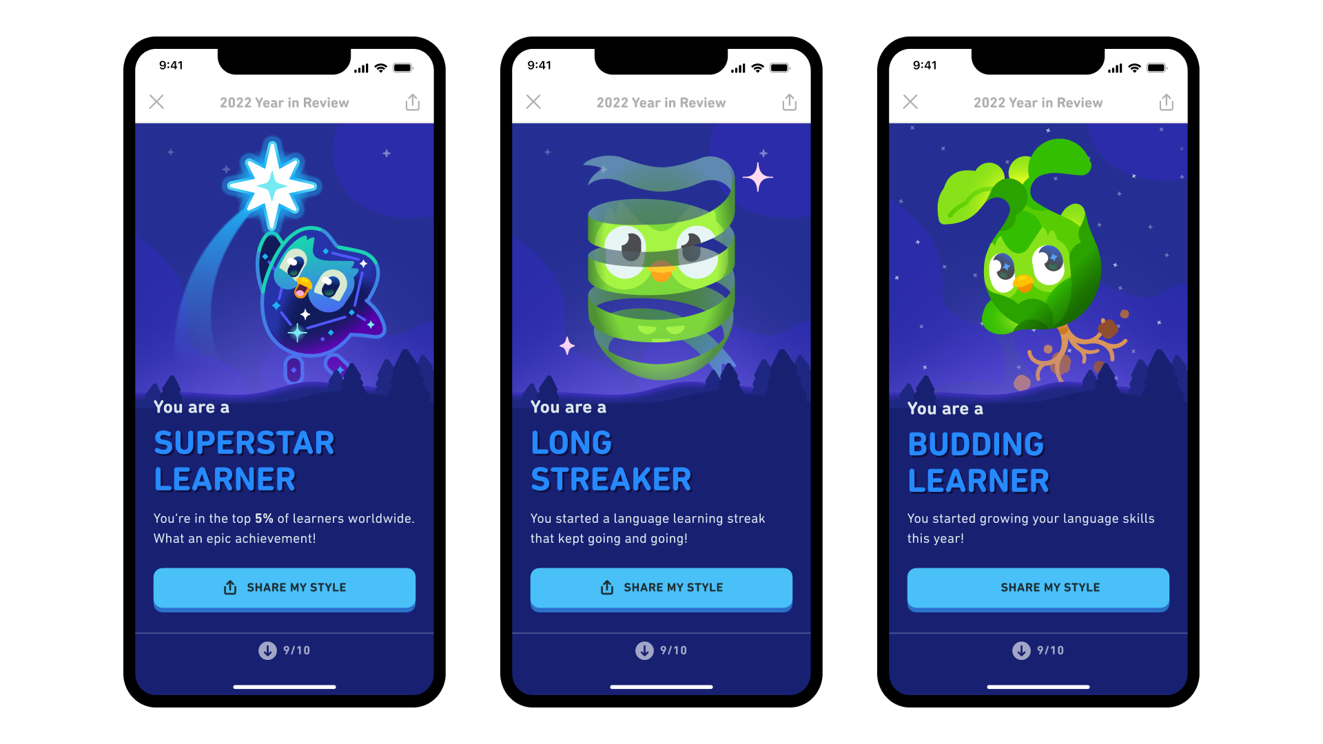 'Tis the season for reflecting on your achievements—and at Duolingo, we make sure those achievements are celebrated with a year-end experience we call “Year-in-Review!” What started as an end-of-year email has evolved into an essential in-app experience that provides learners with a personalized learning style and a look-back at their learning stats.