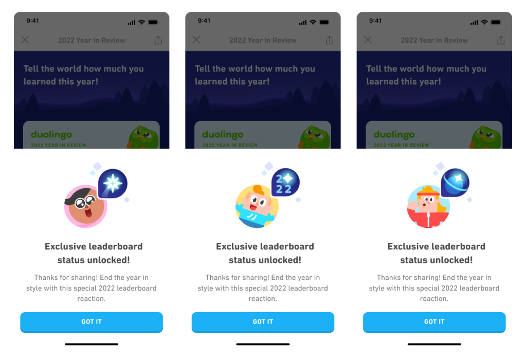 Since 2020, we’ve continued to evolve the in-app experience by adding more personalization, assigning each learner a unique learning style based on their behavior, and ensuring that the experience is so delightful that everyone wants to share it! One of the things we saw in initial versions of Year-in-Review was that learners loved sharing comparison stats—aka their XP percentile ranking. In 2021, we highlighted that stat in the share card, which increased overall share rates (especially for our top learners!)